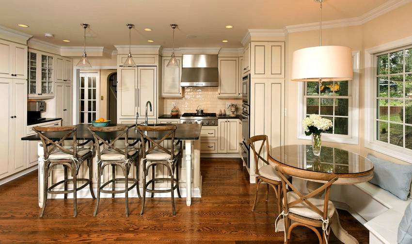 В традиционной классической кухне используют мебель с коваными опорами, деревянными ножками, конструкции из резного камня. В деревенском стиле уместными будут плетеные подстолья и все те же кованые опоры, столешница может быть в оригинальном обрамлении.