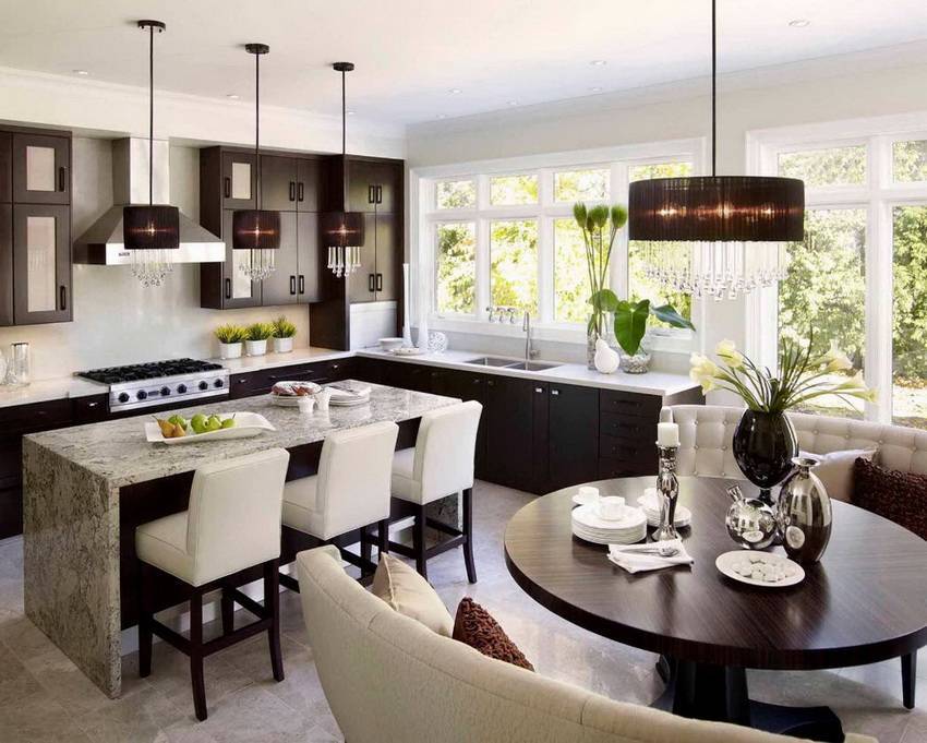 Обеденный стол играет важную роль в столовой зоне, ведь именно за ним вся семья будет проводить много времени. Наиболее удобным и красивым считается круглый кухонный стол. За ним с легкостью поместится большое количество гостей.