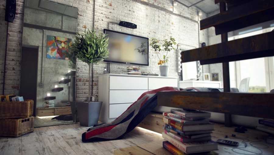 Стоит отметить то, что этот стиль в подлинном виде можно реализовать в достаточно просторной квартире-студии с высокими потолками и большими окнами. Наличие кирпичной или бетонной серой стены, открытых коммуникаций будут недвусмысленно говорить о стилистике помещения.