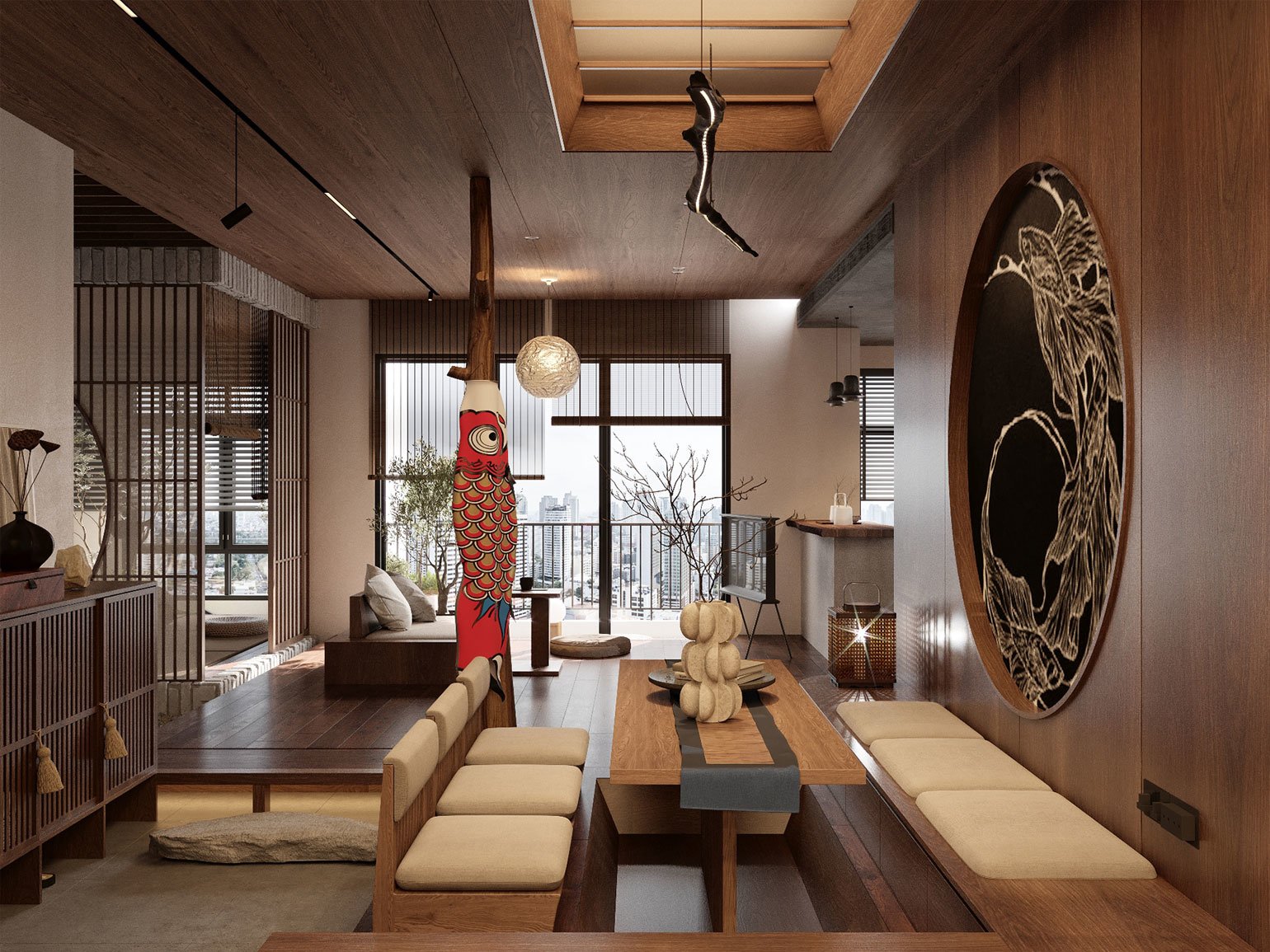 Ключевые элементы. Пространство оформляют в сдержанных природных оттенках ― бежевого, коричневого, зелёного, терракотового, иногда их разбавляют чёрными или красными акцентами. Стены покрывают обоями, драпируют тканью или, отдавая дань традициям, оформляют деревянными рамами, панелями, рисовой бумагой. Материалы также преобладают природные: дерево, камень, натуральная ткань, глина, бамбук.