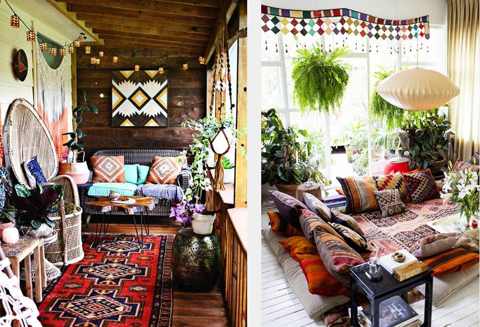 Один из самых эклектичных стилей в интерьере, что не удивительно, ведь бохо в переводе с французского значит «цыганский». Подушки с вышивкой, разнообразный текстиль с орнаментом, ковры, непарные предметы мебели, винтажные светильники, живые растения, много контрастных и ярких цветов.