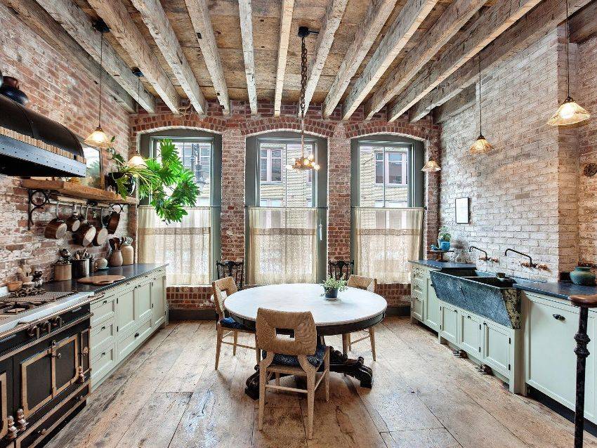 Эталонная кухня в стиле лофт должна иметь варочные поверхности стального цвета, фасады из нержавейки и современное техническое оснащение. Все это на фоне натурального дерева и открытой кирпичной кладки придает особый шарм технологичности.