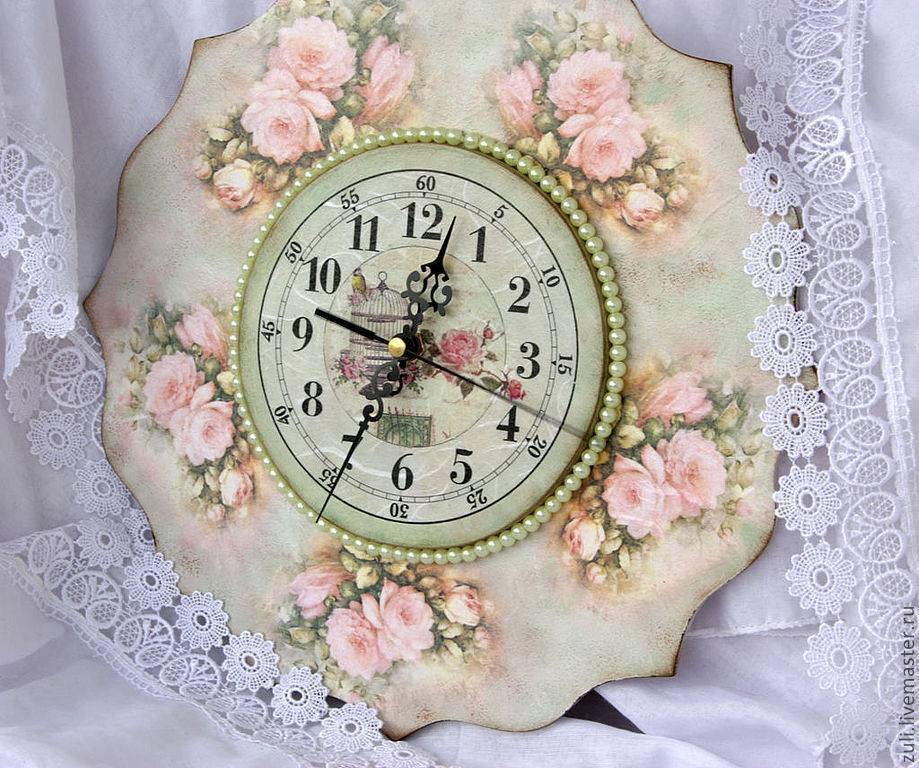 Панно или настенные часы могут быть оформлены в технике декупаж. При выборе картин предпочтителен деревенский стиль, пейзажи или флористические мотивы.