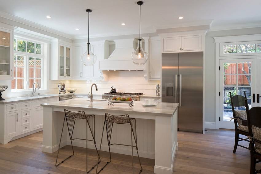 Расстановка контрастов отлично срабатывает и с мебелью: если кухня и гарнитур белого цвета, то следует подобрать тёмную мебель.