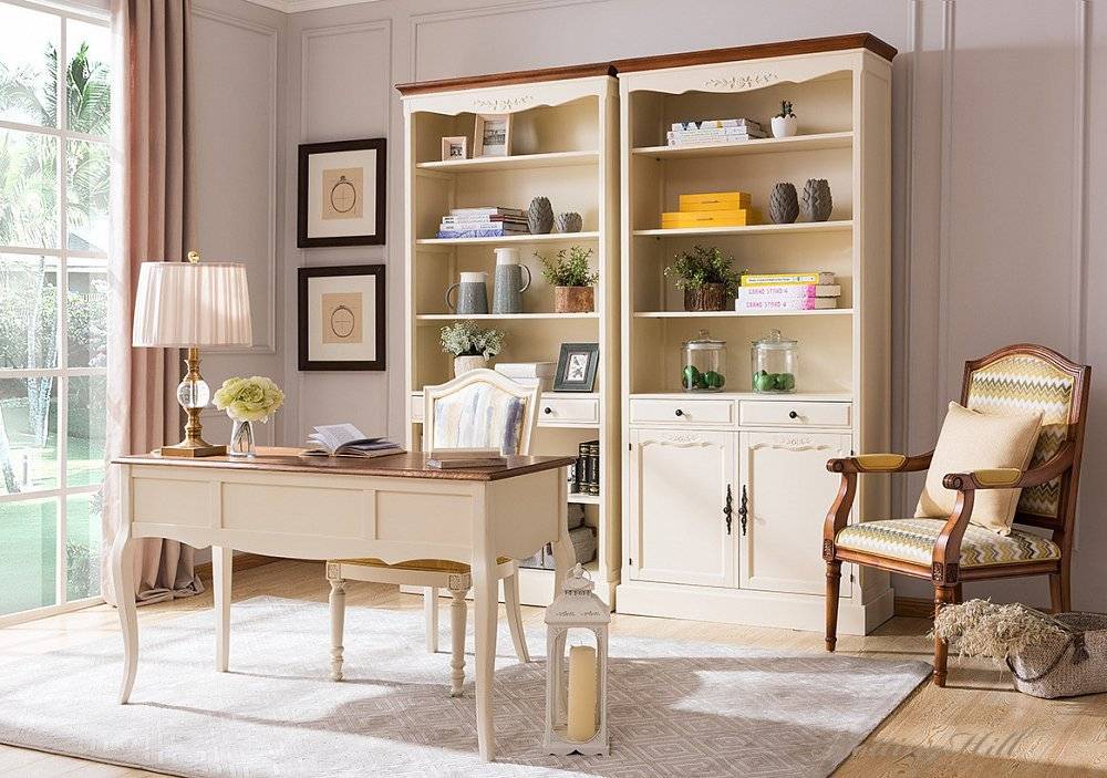 Стены и потолок кабинета в стиле прованс могут быть отделаны деревом или штукатуркой. Мебель кованая или из массива дерева. Уюта в интерьер добавит ковер, живые цветы в вазе и картины или фотографии в красивых рамках.
