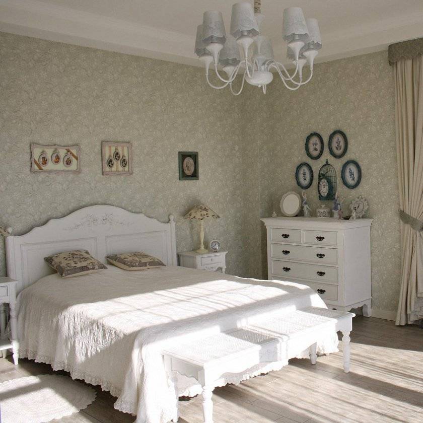 Для стен используйте штукатурку или краску. До недавнего времени обои в этом направлении не использовались. Но смешение направлений потихоньку стирает четкие границы и на стенах уже можно встретить фотообои с пейзажами французской глубинки или просто светлые полотна в маленьком цветке.