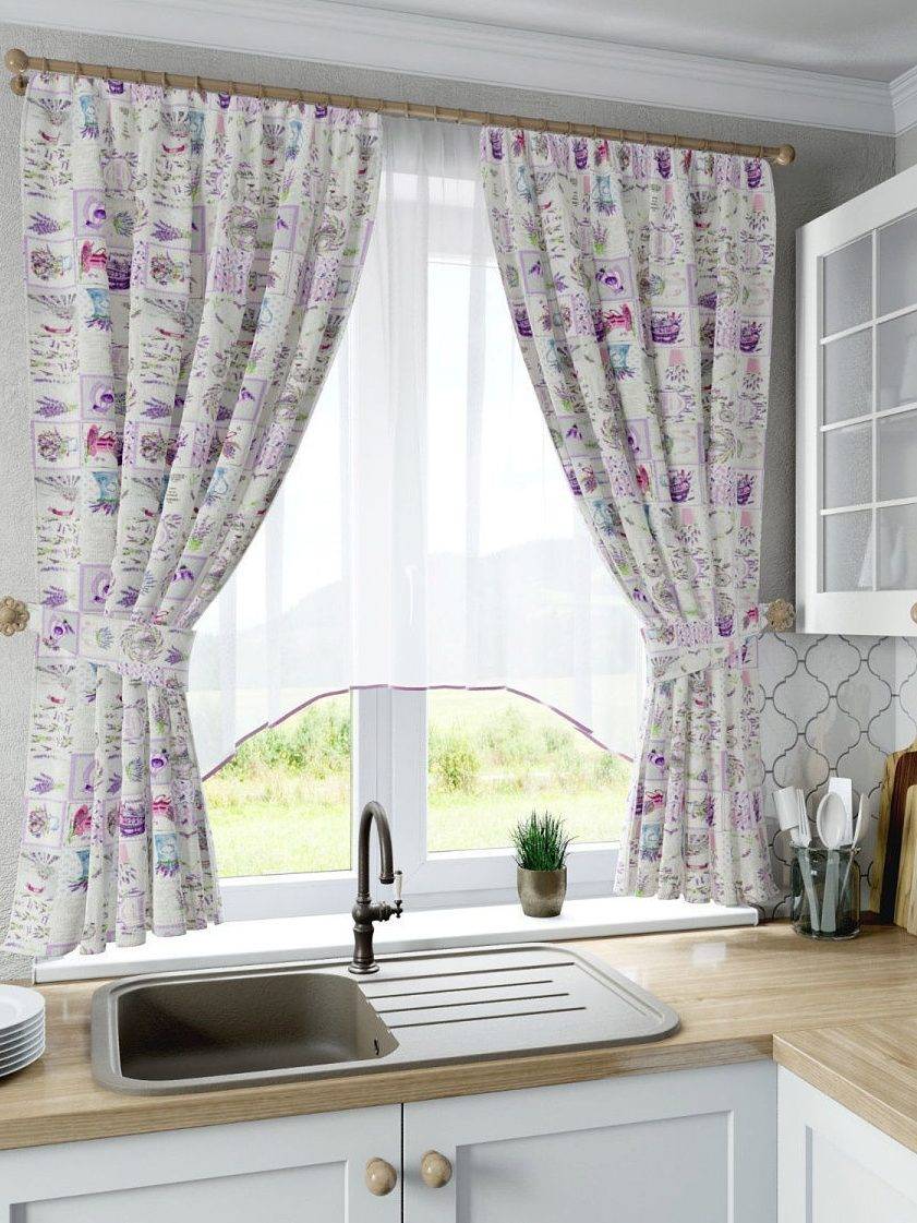 Шторы подбираются из ткани, которая легко стирается. Предпочтение отдается французскому или римскому варианту. Если в кухне уже присутствует акцентное пятно, то изделия должны быть светлыми и полупрозрачными. Если посредством штор в кухню вносится яркость, тогда рекомендуются изделия с мелким растительным орнаментом, выполненным на светлом фоне. Допускается сдержанная клетка.