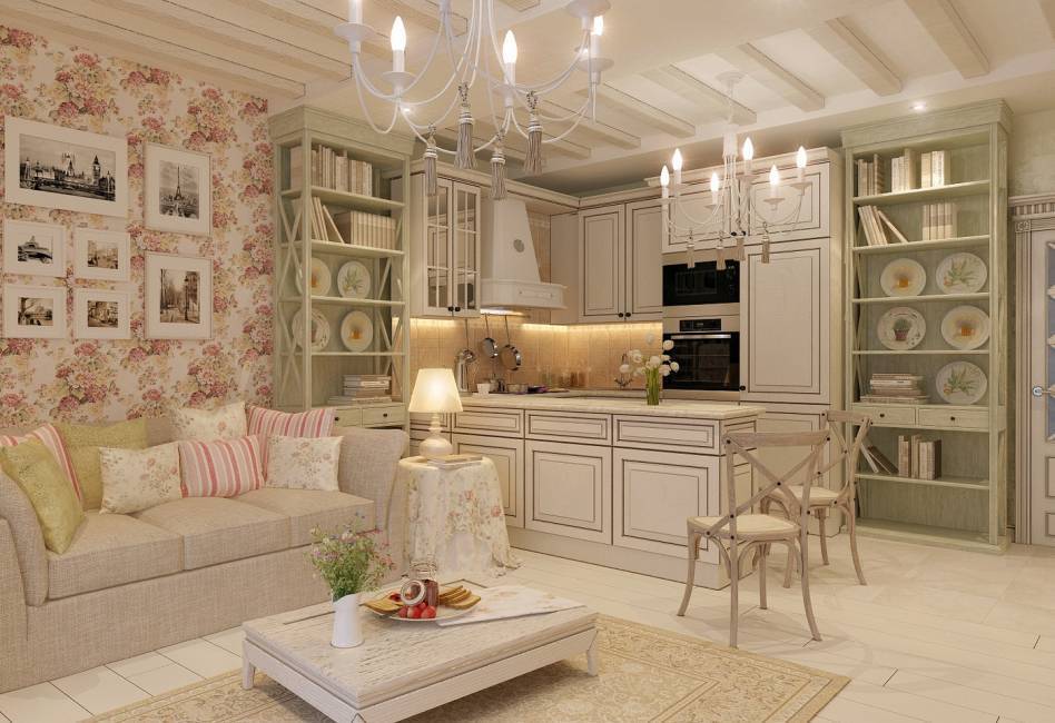- Обои. Желательно, чтобы они напоминали обычные обои из бумаги, с мелким узором из роз. При этом на самом деле это должны быть либо обои со стеклом, либо флизелиновые обои, иначе менять их придется всего через пару лет.