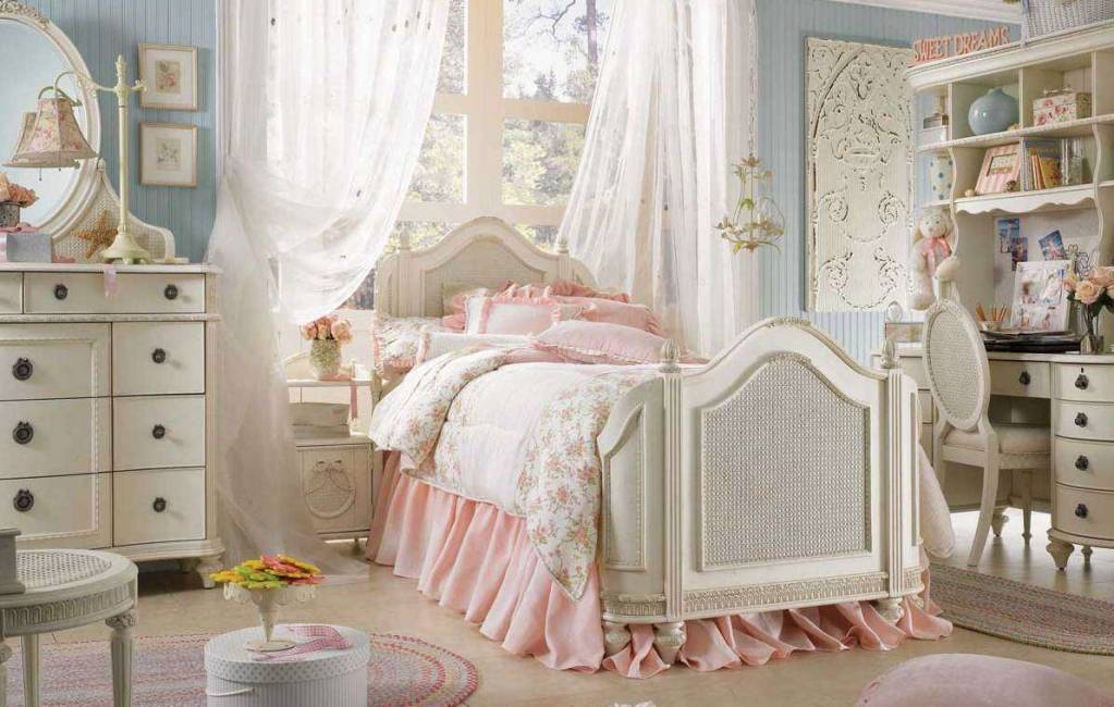При ее декоре важно уделить внимание декору мебели и текстиля. В интерьер удачно впишутся туалетный столик, комод, изящные стулья и прикроватные тумбочки. Легкости помогут добавить лампы с тканевым абажуром, тонкая тюль на окнах, небольшие картины или фотографии
