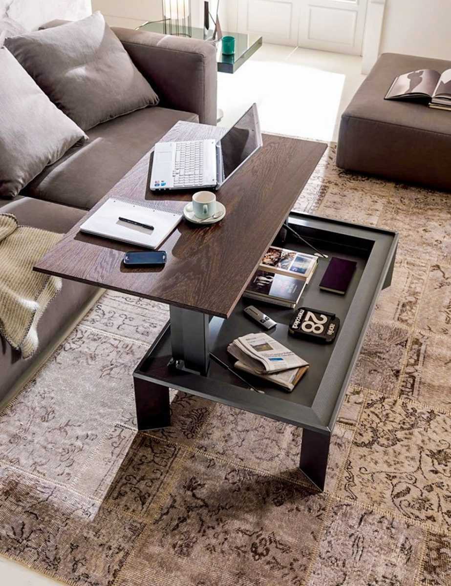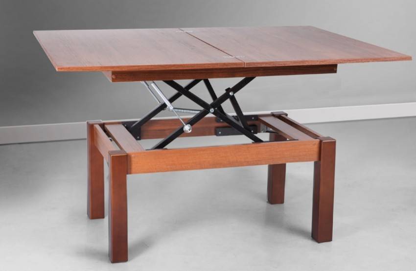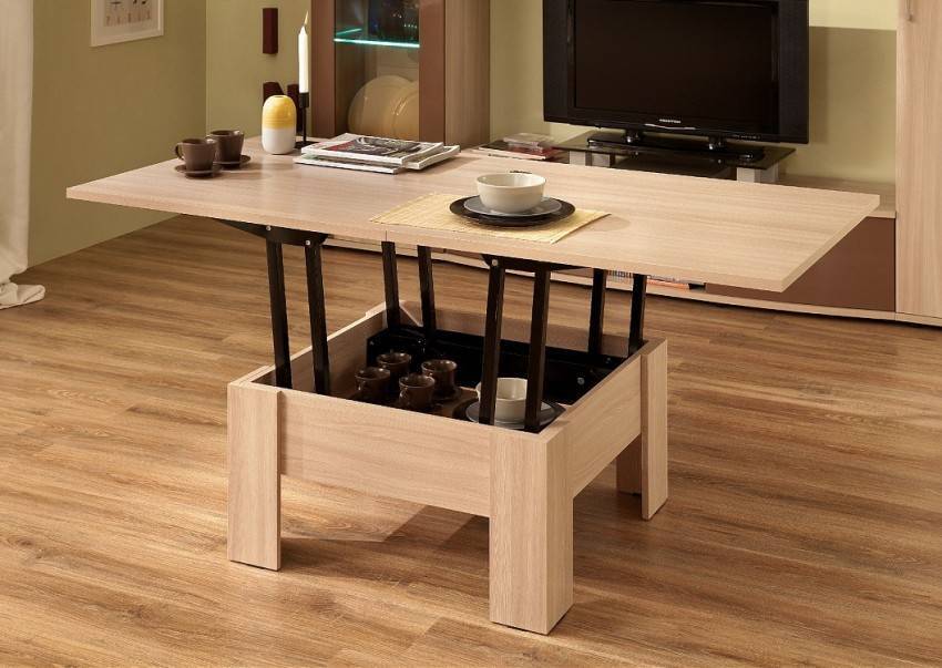 Для малогабаритного жилья вам просто не обойтись без подъёмного трансформирующегося стола. В обычном положении он представляет из себя привычный для всех журнальный стол. Однако с приходом долгожданных гостей его можно раскладывать.