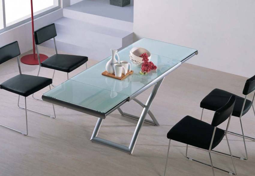 Столешницы столов-трансформеров делают из прозрачного, матового или цветного стекла. Производители мебели используют закаленное стекло толщиной не менее 8 мм. Прозрачный стеклянный трансформер зрительно увеличивает помещение. Стол из цветного стекла будет стильным акцентом в минимализме или хай-теке.
