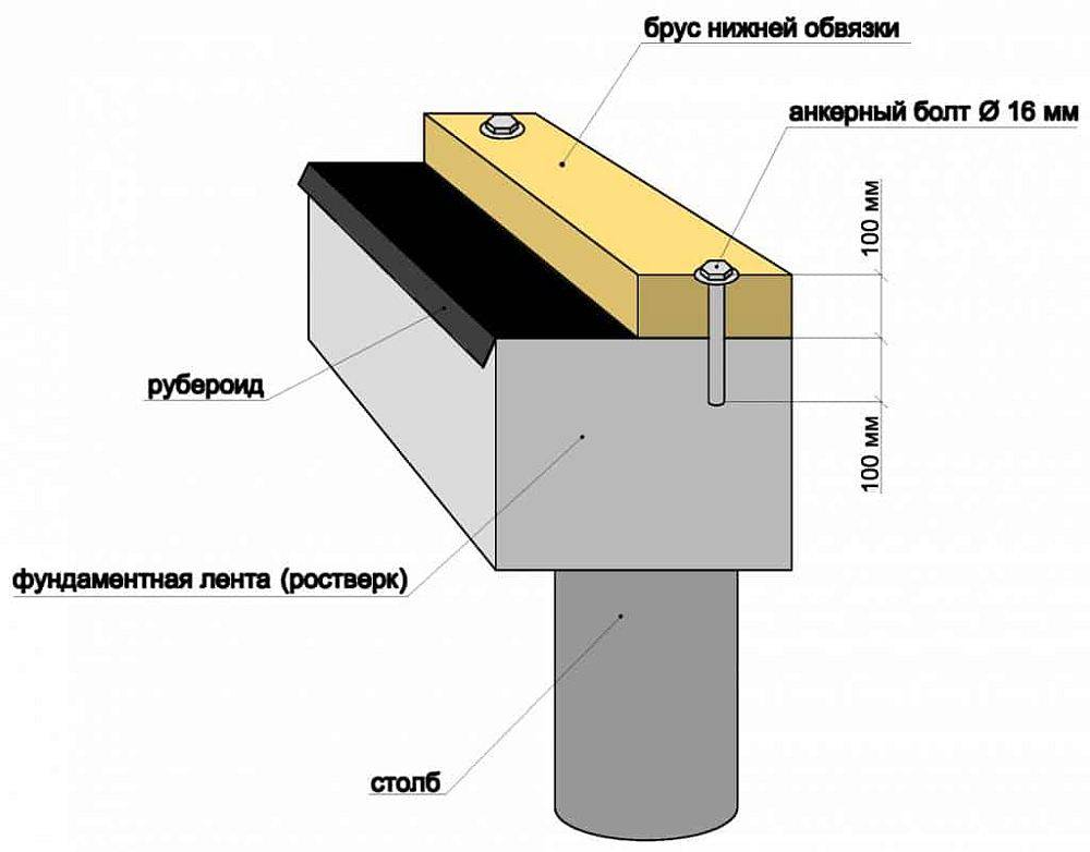 Перед обвязкой необходимо произвести гидроизоляцию фундамента. Проще всего использовать рубероид, который крепится с помощью мастики.