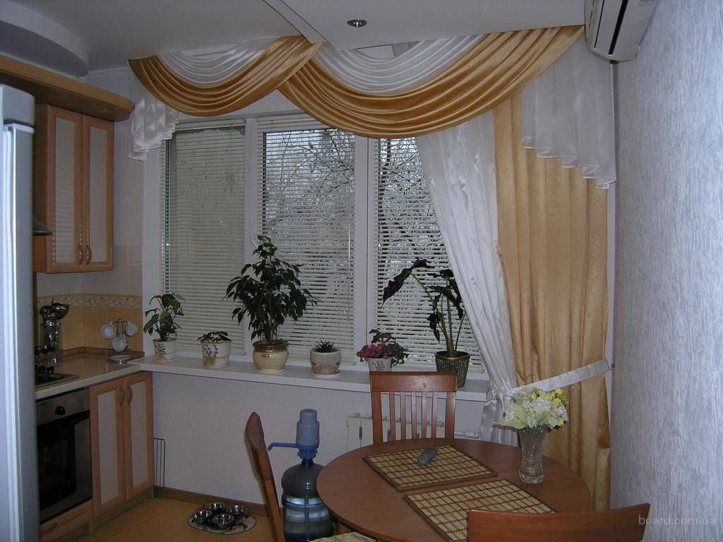 Варианты штор на кухню с балконной дверью из гардинного полотна: