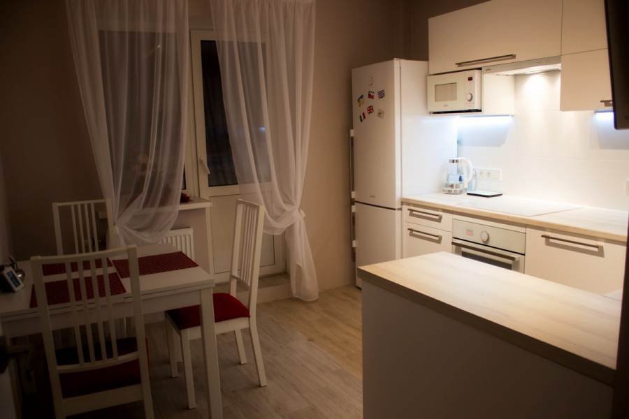 Однотонный, максимально прозрачный тюль украсит кухню с выходом на балкон. Монохромный и сдержанный дизайн делает этот вариант оформления универсальным и подходящим под любой стиль.