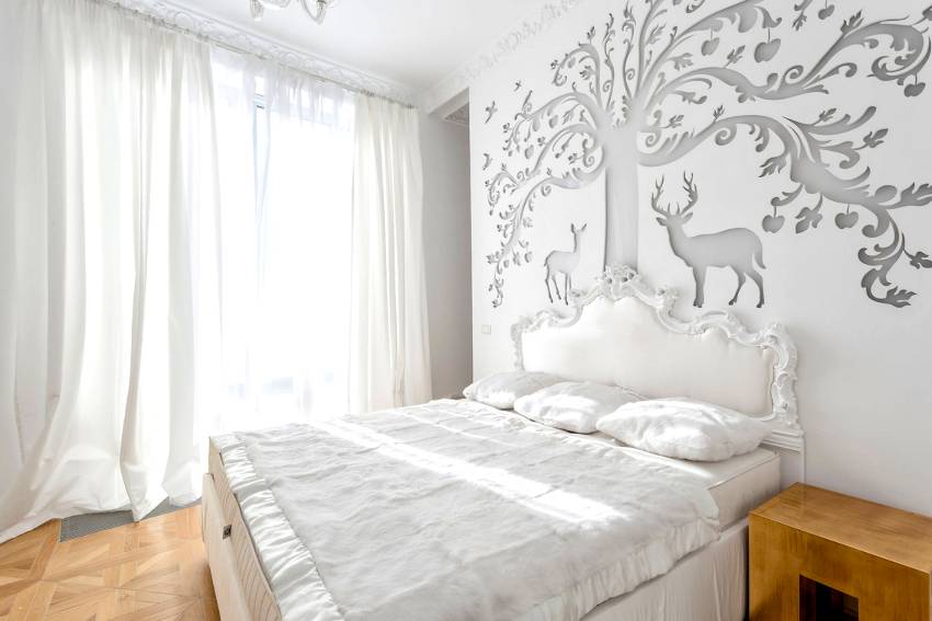 Белой называют спальню, в которой данный цвет доминирует, а значит, помещение имеет белые стены и другие детали интерьера такого же цвета. В зависимости от того, насколько много этих элементов, шторы могут быть цветными или белыми. Если белого много, то именно оконные занавески внесут оживленные нотки. В данном случае оттенок штор может быть контрастным, но не ярким, а глубоким, а также обязательно сочетаться с другими элементами интерьера, такими как напольное покрытие, мягкая обивка мебели, настенные панно и т. д.