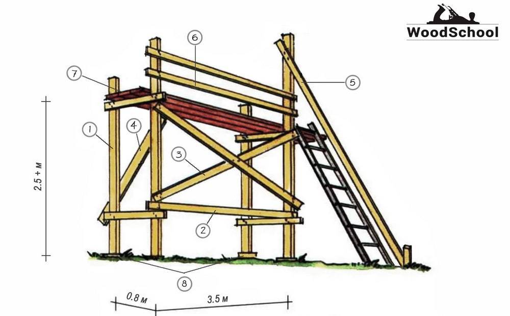 В частности, для создания каркаса выбирают цельный брус шириной не менее 10 см. Торцевые планки конструкции монтируют под острым углом. Две опорные шестиметровые балки укладываются в горизонтальное положение. Расстояние между ними составляет ширину будущих лесов. Рядом на одинаковом расстоянии укладываются еще две шестиметровые балки. Верхние концы балок должны сходиться под небольшим углом в виде трапеции, это придаст устойчивость будущим лесам.