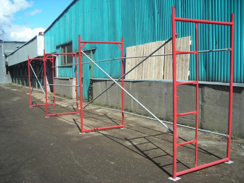 Рамные. Из круглой или прямоугольной трубы свариваются рамы одинакового размера. Соединяются они между собой поперечными трубами и укосинами. Имеют модульное строение, легко наращиваются как в высоту, так и в длину. Имеют определенный шаг по длине — 1,5/2/2,5/3 метра, по высоте одна секция обычно составляет 2 метра, стандартная глубина — 1 м. В некоторых рамах предусмотрены колеса — для более легкого передвижения по ровной поверхности. Соединение элементов флажкового типа — на раме приварены штифты с прорезью, в которую вставляется флажок. В поперечинах и укосах сделаны отверстия. Элементы надеваются на штырь, фиксируются при помощи флажка. Наращиваются вверх секции при помощи соединительных труб меньшего диаметра, приваренных к стойкам рам с одной стороны
