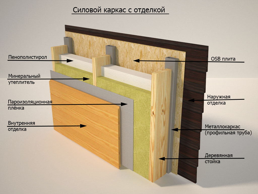 Каркасной основой могут выступать металлические трубы с прямоугольным сечением или деревянные брусья. А в качестве материала для обшивки каркаса вы можете выбрать осп или вагонку, качественную фанеру, профнастил, сайдинг и другие материалы.
