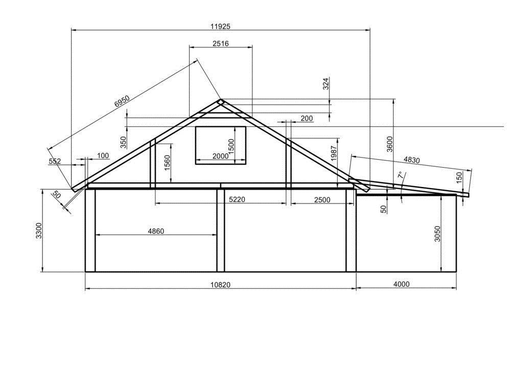 Асимметричная стропильная система двухскатной крыши | Конек смещен в одну из сторон дома или скаты с различными углами наклона. Более сложная для расчетов стропильная система крыши. Если в упрощенном варианте можно рассчитывать один скат и полученные данные автоматически применять для второго, то для асимметричной стропильной системы такой вариант использовать нельзя. Преимущества – оригинальный внешний вид. Недостатки – сложность расчетов и монтажа и уменьшение используемого чердачного пространства. |