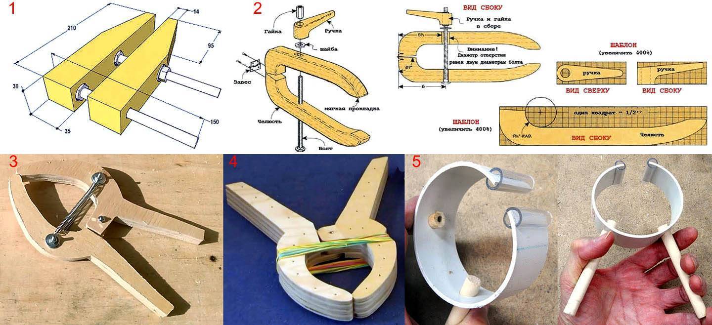 Выпиливать и подгонять заготовки фанерных струбцин-крокодилов дело трудоемкое, но в распоряжении современного умельца оказывается отличный заменитель – обрезки ПВХ труб большого диаметра. Разрезное кольцо из трубы, пара деревянных палочек, столько же обрезков садового шланга, и струбцина для прижима при склеивании готова, поз. 5. Дешево и сердито. Еще о струбцинах из дерева см. ролики: