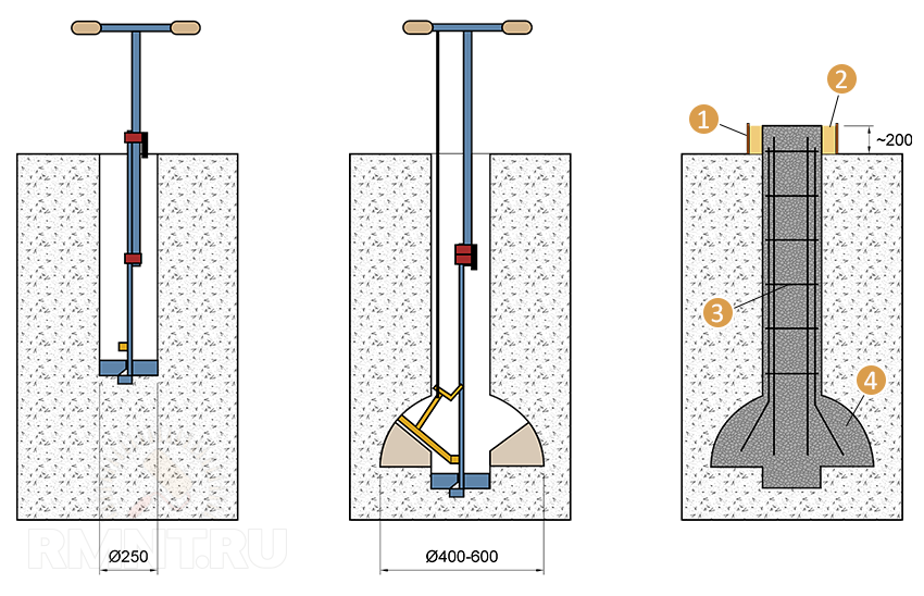 Обычный ручной инструмент и оснастка мотобура позволяют пробурить скважины 50 см диаметра максимум. Чтобы изготовить уширение стандартного столба при использовании классической технологии, придется либо отрыть шурф большего размера, либо привлечь ямобур для бурения скважины соответствующего диаметра.