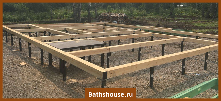 - Соединение свай. Чтобы соединить опоры, делают ростверк. Под баню подойдет брус либо бревно. Древесину кладут на оголовки, выполняя в ней вырезы под них. Затем скрепляют брусья по углам. К оголовкам раму крепят болтами. Далее возводят стены, закрывают их крышей.