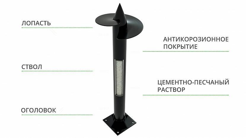 Внешне винтовая свая напоминает садовый бур и состоит из следующих частей: