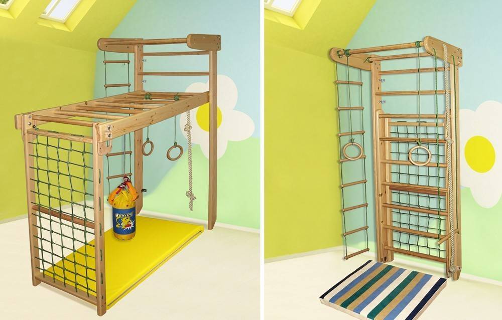 Детский спортивный комплекс может быть непохож на традиционную шведскую стенку, но представлять собой спортивный уголок, совмещенный с интересной игровой зоной
