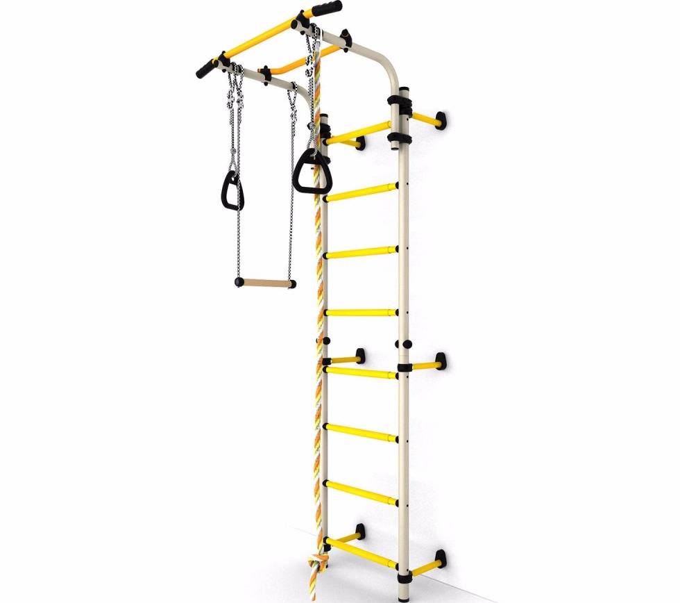 І – образная конструкция шведской стенки является самым простым вариантом. Она представлена двумя стойками и перекладинами. Крепиться к стене или враспор. Здесь не предусмотрено добавление дополнительных навесных снарядов.