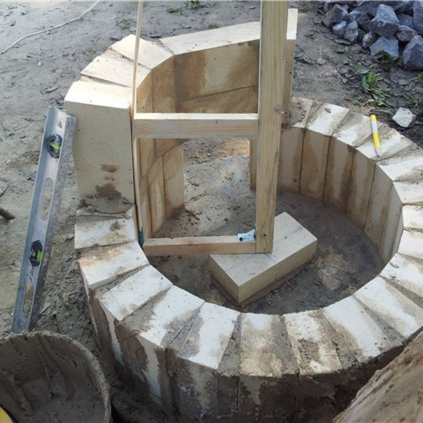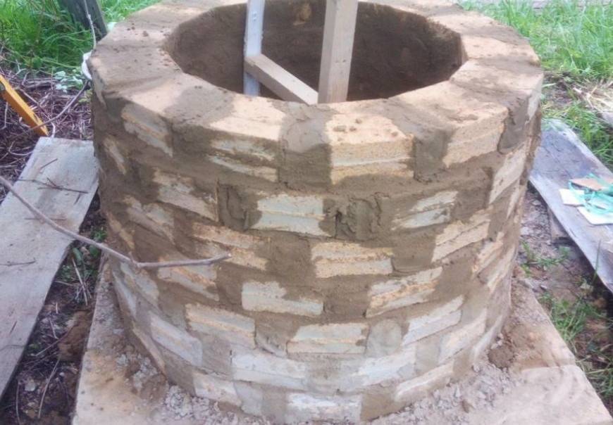 Здесь применяются половинки стандартного красного кирпича, но кладутся они тычком. Такими частями выкладывается примерно 60 сантиметров всей конструкции. После достижения такой высоты, нужно постепенно сужать кладку, пока горловина не будет равна 50 см.