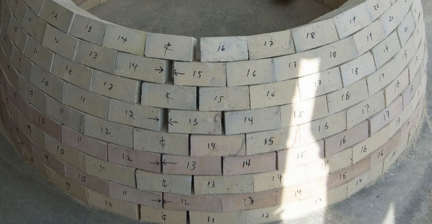 Оптимальный вариант кладки тандыра даже для новичков. Здесь основное преимущество в том, что кирпич укладывается не на тонкое ребро, а на широкую часть. Кирпич можно не резать, если заранее предусмотреть закладку раствора.