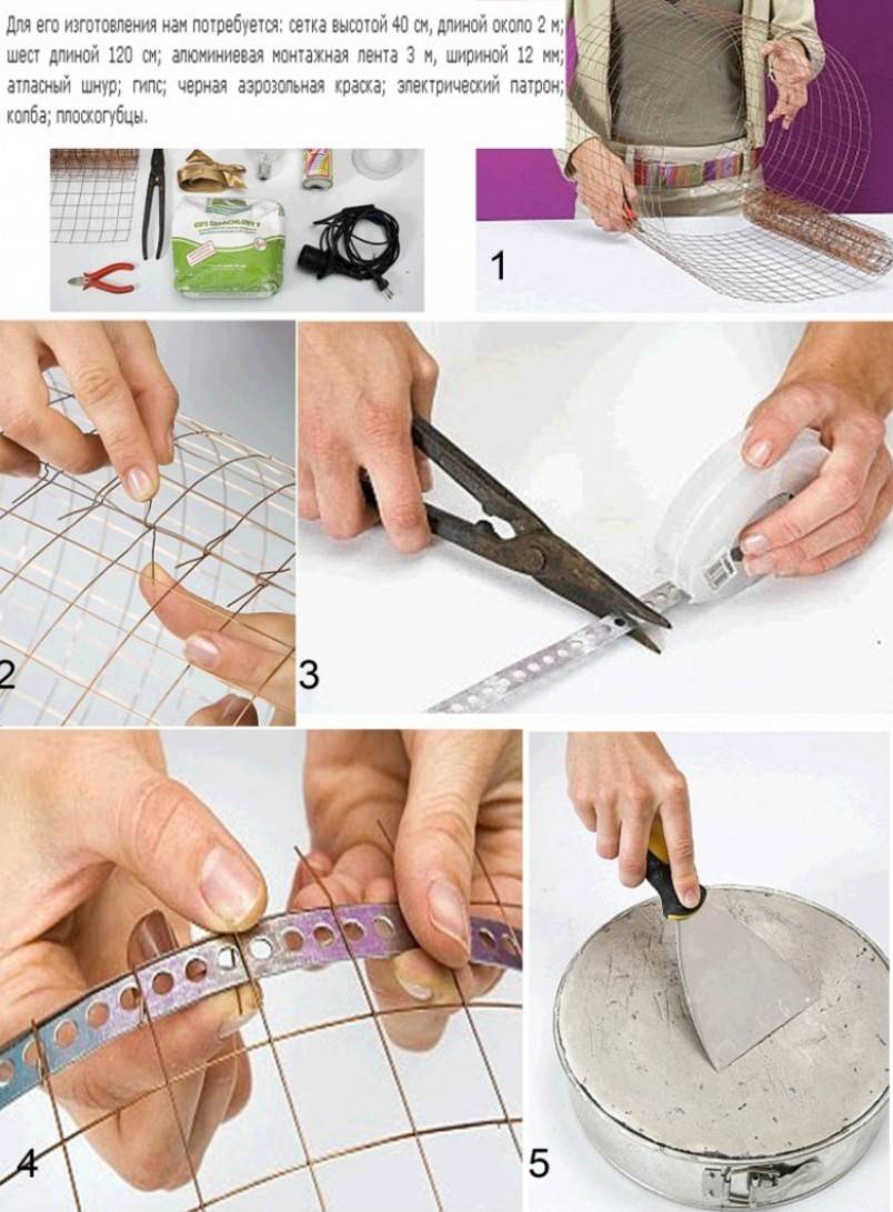 Каркасы делают из различных материалов – металла, дерева, пластика. Для изготовления своими руками металлического каркаса для лампы берут жесткую проволоку.