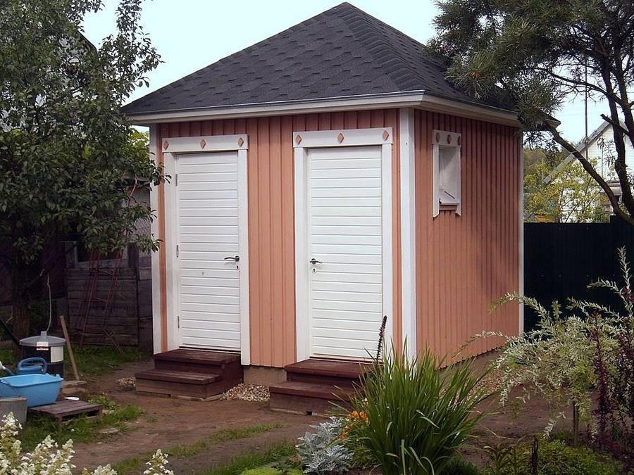 Металл. Этот материал на туалет практичнее древесины: оцинкованный профлист, например, не требует обработки перед установкой. Но в то же время он легкий, конструкция на каркасе собирается буквально за день.