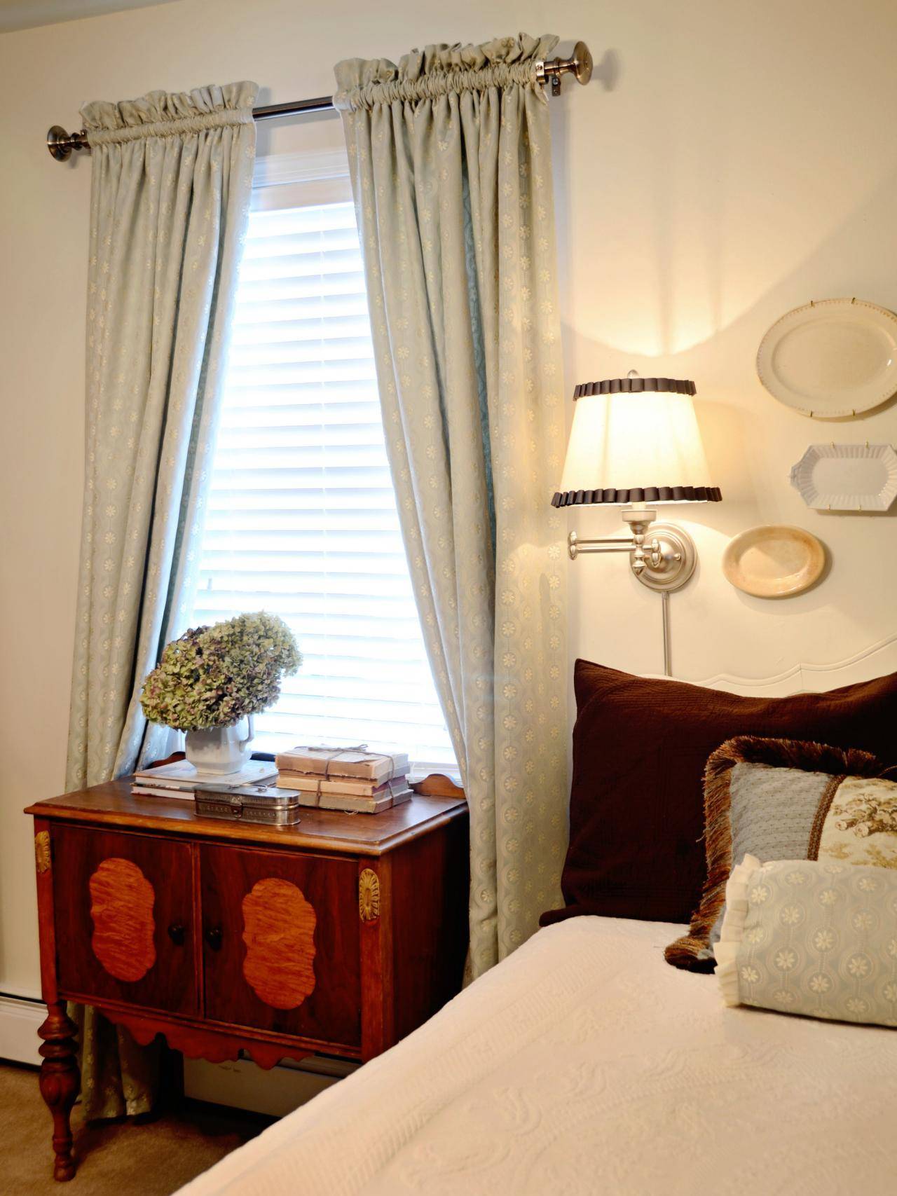 - Длина занавесок в спальне зависит от создаваемого стиля — она может быть до подоконника, на расстоянии от пола на 3-5 см или спускаться в пол.
