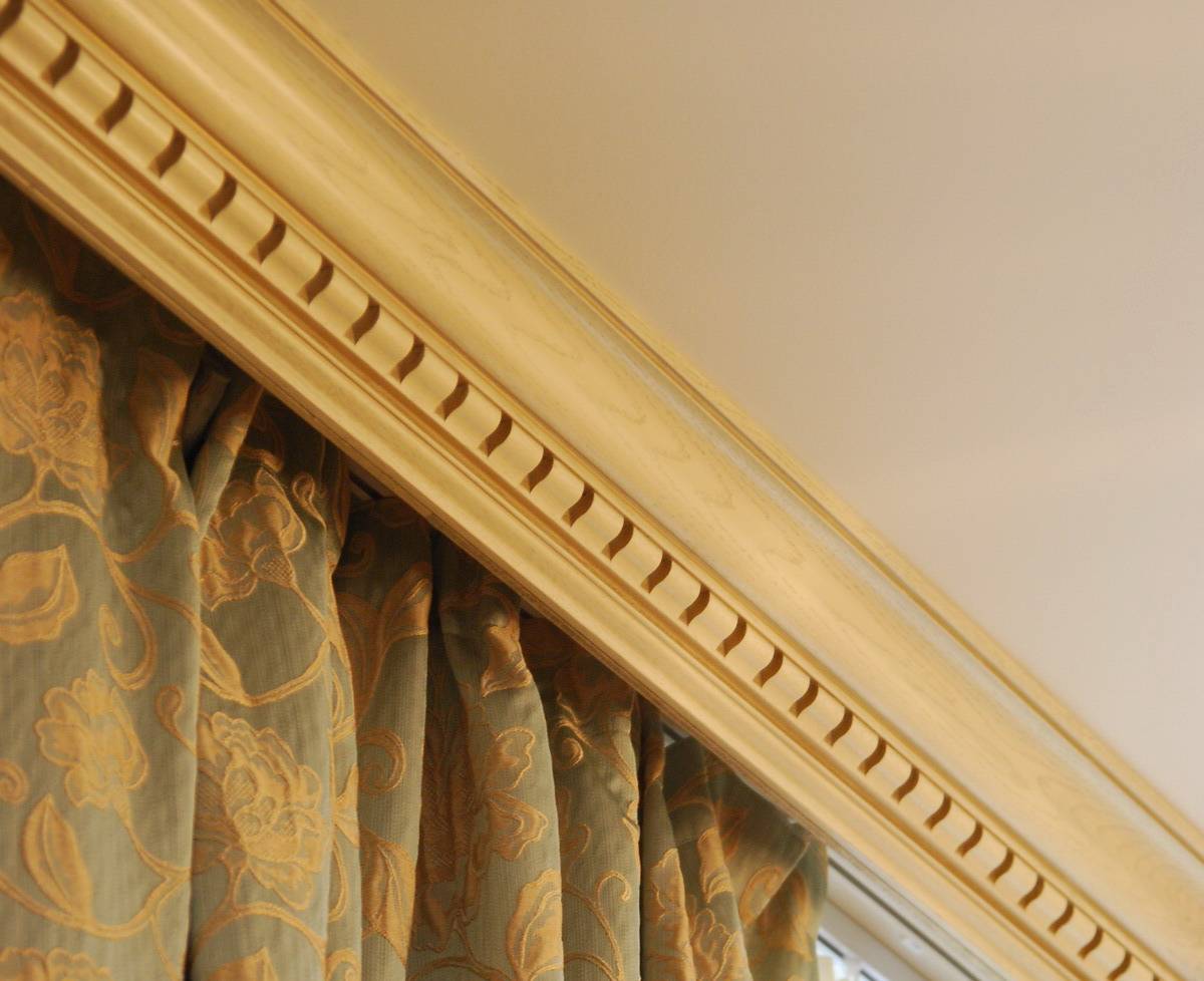 - Багетные — с декоративной планкой. Она закрывает крючки и держатель. Карниз потолочный