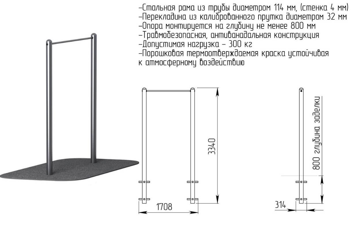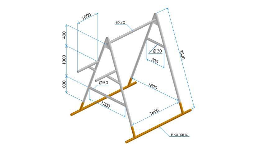 подготовить ямы для установки столбов. Заглубление должно быть не менее 0,5 м, при увеличении веса/роста пользователя необходимо увеличивать и заглубление. Так, для турника с высотой перекладины 2,2 м и выше лучше заглубить столбы на 0,7…0,8 м