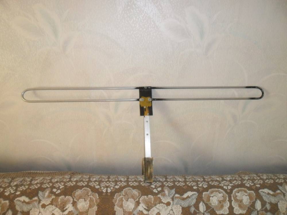 Последнее действие: петлю посередине крепят к штанге, к ней же прикручивают идущий вниз кабель. Штангу поднимают на требуемую высоту и там «настраивают». Для настройки нужны два человека: один поворачивает антенну, второй смотрит телевизор и оценивает качество картинки. Определив, откуда лучше всего принимается сигнал, антенну, сделанную своими руками, закрепляют в этом положении. Чтобы долго не мучатся с «настройкой», подсмотрите куда направлены приемники соседей (эфирные антенны). Простейшая антенна для дачи своими руками сделана. Устанавливаете и «ловите» направление, поворачивая ее вдоль своей оси.