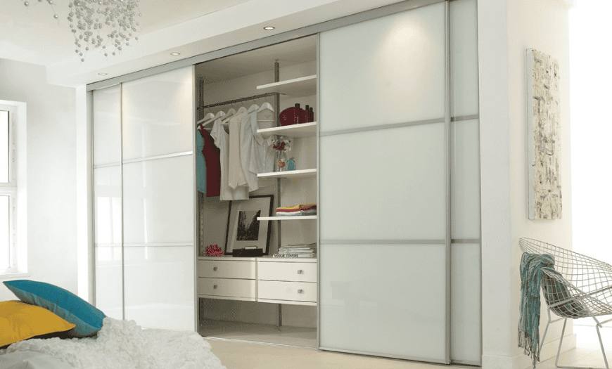- Закрытые системы прикрывают раздвижными или распашными дверцами. По сути, это угловые шкафы, скомпонованные в единую конструкцию.