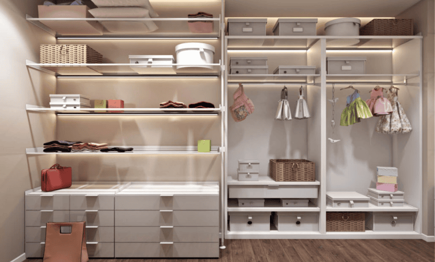 При выборе гардеробных, подборе элементов наполнения учитывают количество обитателей, их пол и возраст. В детских гардеробных для мальчиков преимущественно устанавливают полки. Девочкам для нарядов нужны штанги, выдвижные вешалки.