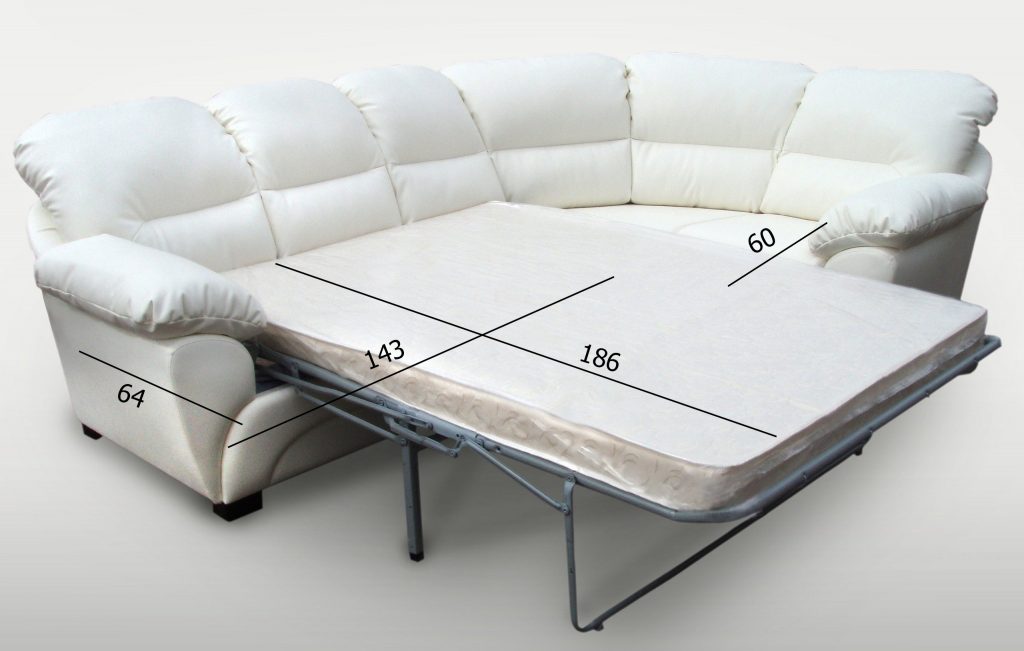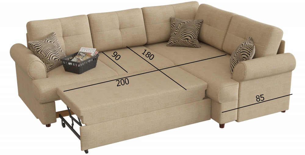 Важное значение для такой формы составляет размер спального места. Угловые диваны, трансформирующиеся в большую двуспальную кровать шириной до полутора метров, наиболее популярны. 70 см составляет ширина одного спального места, до 200 см – трехместной модели