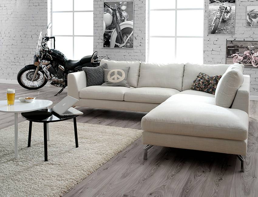 Для того чтобы дополнить комнату данного стиля диваном, необходимо обратить внимание на самые простые модели. Они должны обладать ровной геометрической формой: чем меньше будет на них закруглений, декора, текстур ткани тем лучше мебель впишется в заявленный стиль. Диваны обычно выполняются в сером, белом, бежевом или же черном оттенках