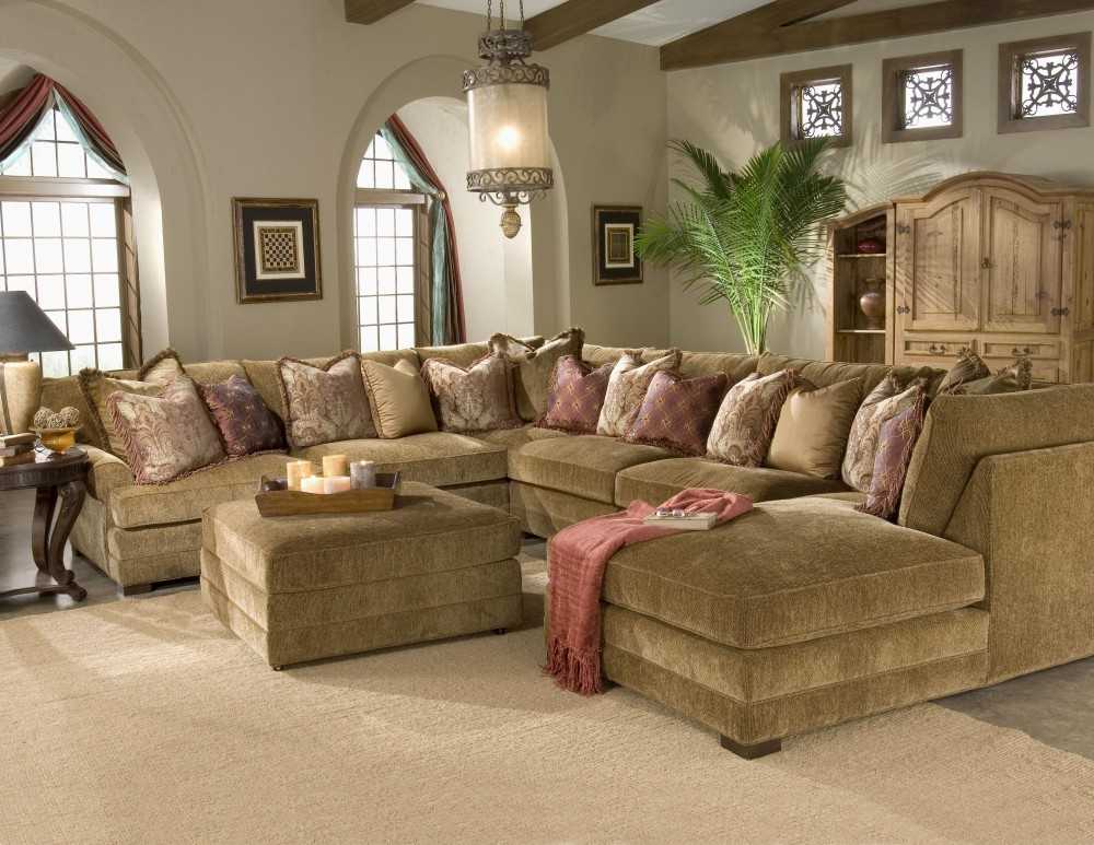 В гостиной, имеющей большую площадь, можно позволить себе более разнообразные формы диванов. Это и плавная изгибающаяся линия, словно берег моря; и круглая форма, напоминающая остров посреди океана; и, конечно же, квадратная, п-образная или угловая формы. Таким диваном вы легко можете зонировать то или иное пространство для работы, встречи гостей или релаксации перед камином. А большое количество мягких подушек только усилит ощущение уюта и комфорта.