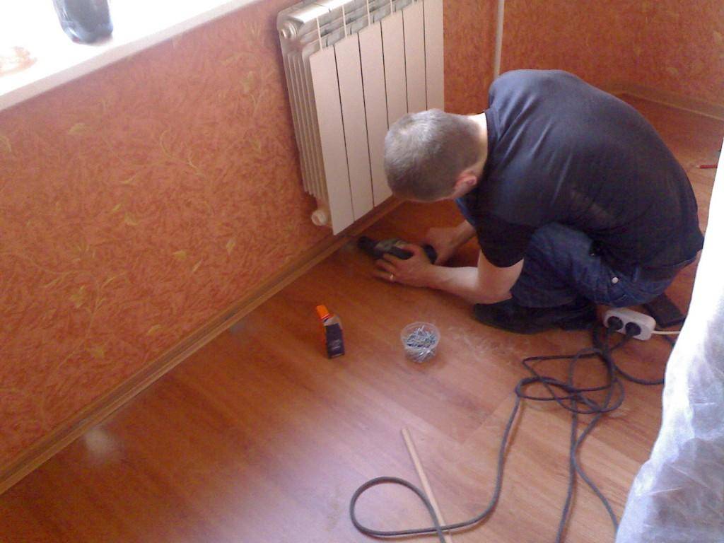- используйте плинтус в качестве дополнительной фиксации. Прибивая его, следите за плотностью прилегания плинтуса к линолеуму.