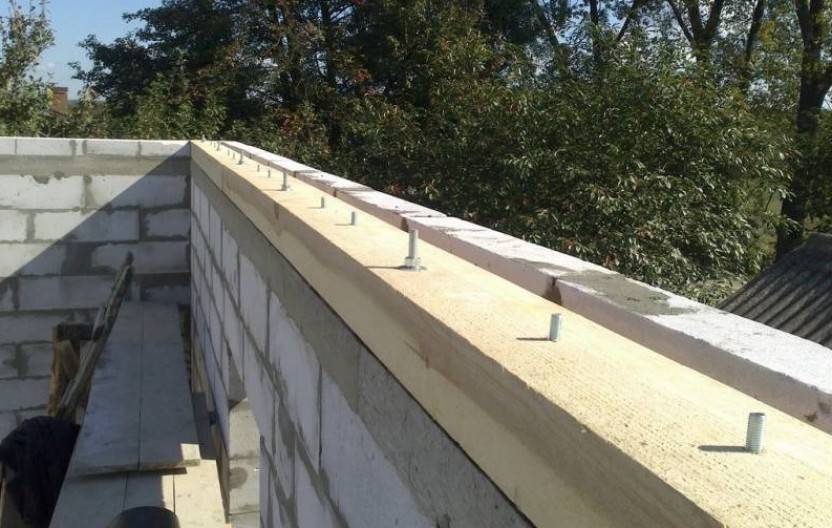 Главная особенность, которой армопояс под мауэрлат отличается от других видов усиления – наличие в нем анкерных шпилек. С их помощью брус прочно фиксируется к стене без риска отрыва или сдвига под действием ветровых нагрузок.