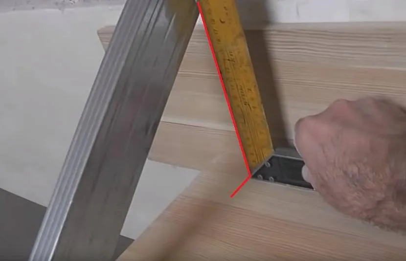 - В верхнюю и нижнюю ступень вкручивается саморез, между ними туго натягивается монтажная нить. По нити, с помощью угольника и учетом рекомендованного расстояния между балясинами, на каждой ступени отмечается осевой центр установки шпилек.