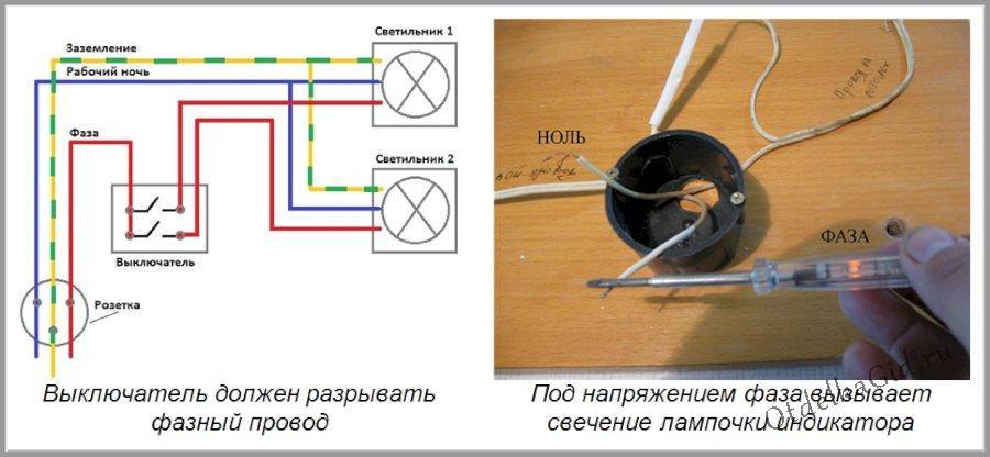 При монтаже выключателя на разрыв ставится фазный провод, обнаружить его можно при помощи индикатора, под напряжением лампочка индикатора должна светиться