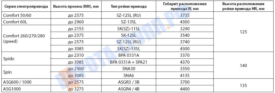 И не забываем про электропривод! Ему тоже нужно место. В зависимости от модели, и высоты проема величина W будет от 3290 до 4400мм. (см. таблицу). Или звоните нам, мы подскажем!