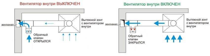 В патрубке установлен лючок, который отрегулирован так, что при включённом вентиляторе закрывает собой входное отверстие. При отключённой вытяжке запорный диск возвращается в исходное состояние и открывает доступ воздуха из вентиляции.
