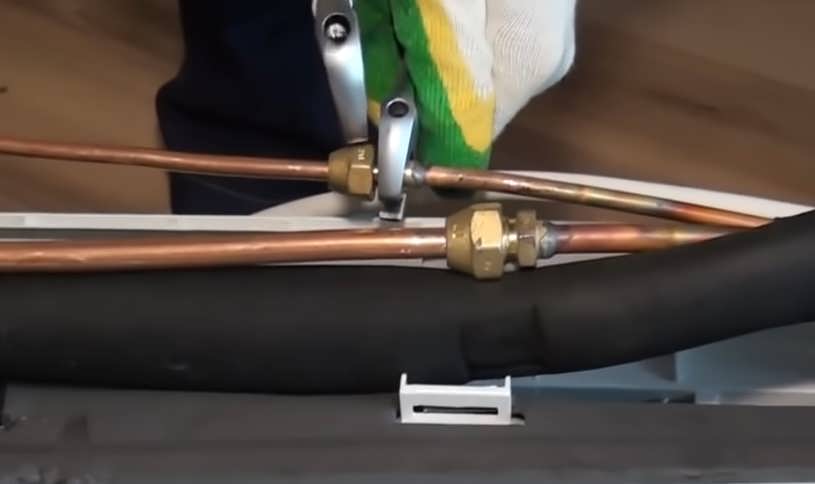 Сперва трубки подключаются к внутреннему блоку. На его боковой стенке имеется два порта со штуцерами разных диаметров. С них нужно скрутить гайки. В результате этого появится шипение, свидетельствующее о том, что из блока выходит азот, который был закачан производителем. Он необходим для защиты внутренних деталей от окислительных процессов.