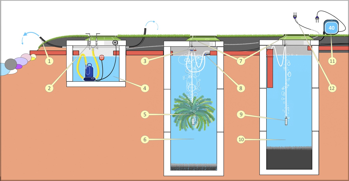 2С почвенной доочисткой: предоставляют собой несколько переливных резервуаров, соединенных между собой трубами; отходы, поступающие в них, под действием гравитации отстаиваются с выпадением осадка на дно, который со временем перерабатывается бактериями; газ, образующийся в процессе разложения, отводят через специальные вентотверстия; отстоянная вода через трубу переливается в фильтрационные колодцы или поля